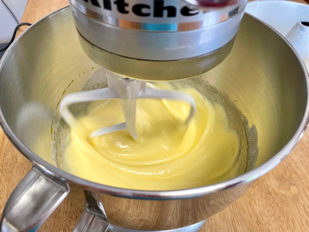 5. Add sifted flour into egg mixture in batches and mix on slow speed until the batter is smooth.