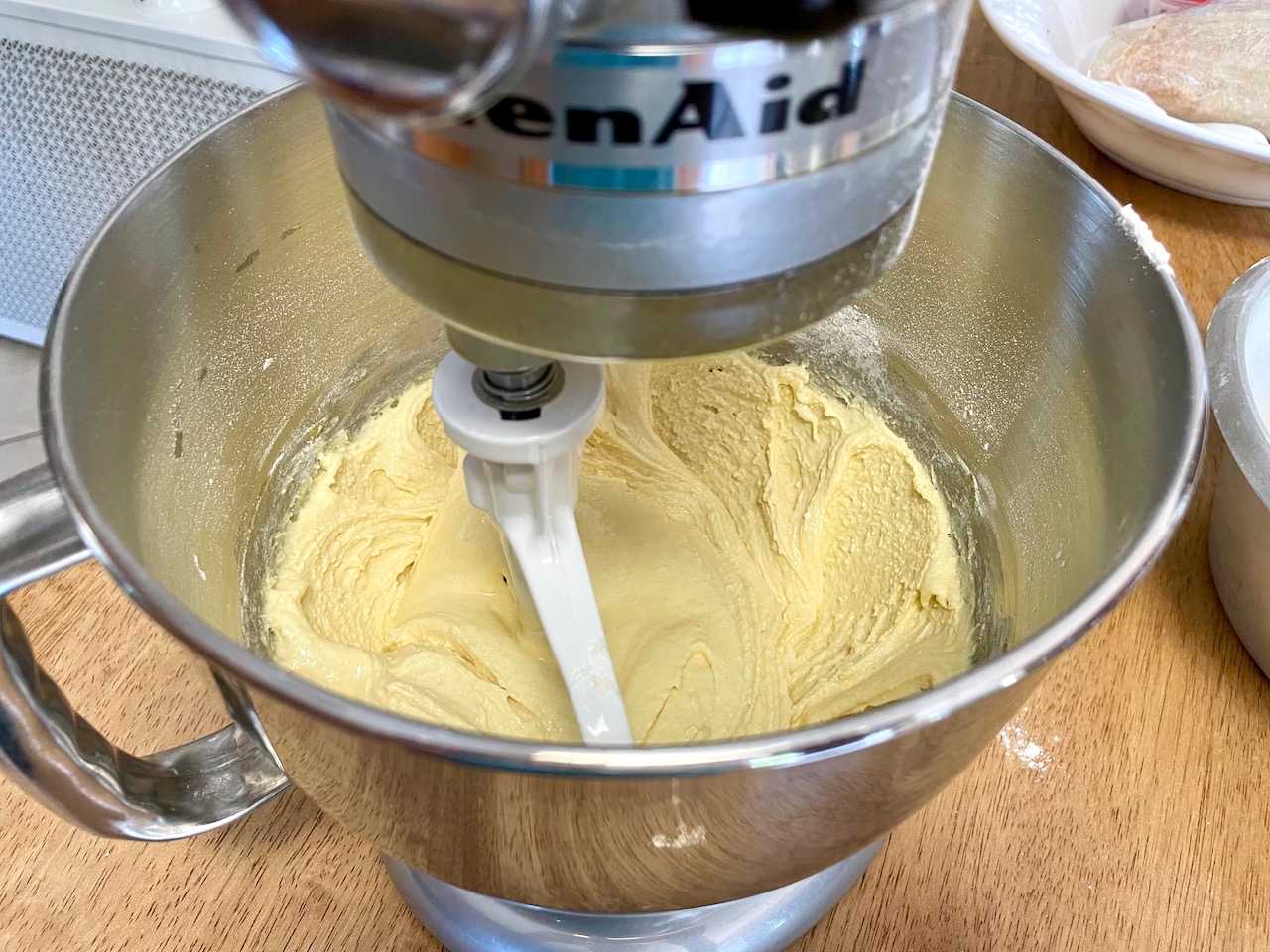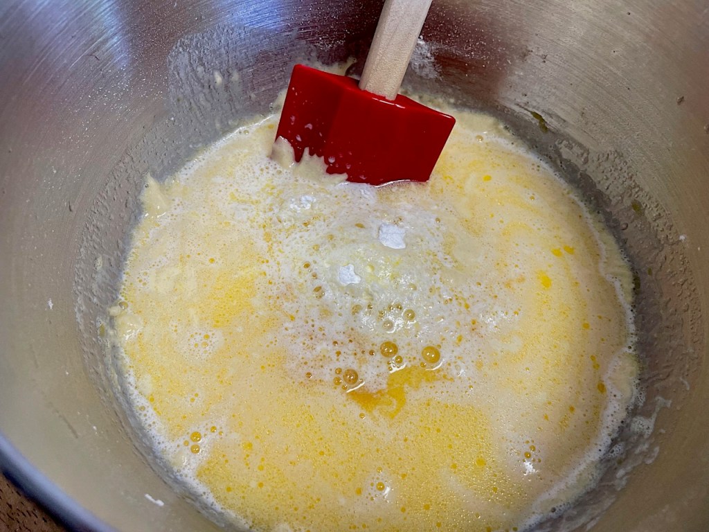 I know what you’re thinking: shouldn’t we have added the baking powder to the flour and sifted them together?  Yeh, probably; but it’s written this way on the old recipe card and I want to stay true to our tradition. My understanding was always that when you saw the baking powder fizzing, you knew the cake would rise. When I was a kid, it was fun to make this cake and watch the baking powder erupt into bubbles of carbon dioxide. This might have been one of my first science experiments. It did not occur to me that those bubbles of CO2 were escaping into the air instead of leavening my cake.