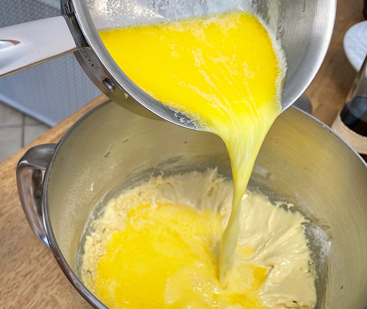 Pour the hot milk and butter mixture into the batter all at once. Add the vanilla extract.