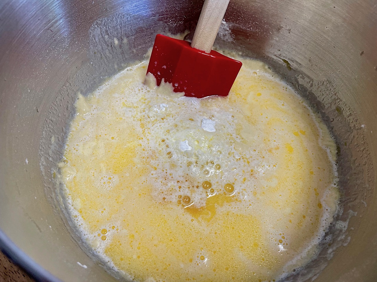 6. Pour the hot milk and butter directly into the batter all at once. Add the vanilla extract and sprinkle the baking powder into the milk puddle. Stir gently with a spoon until the batter is smooth.