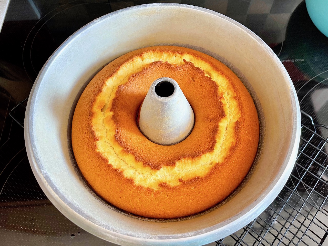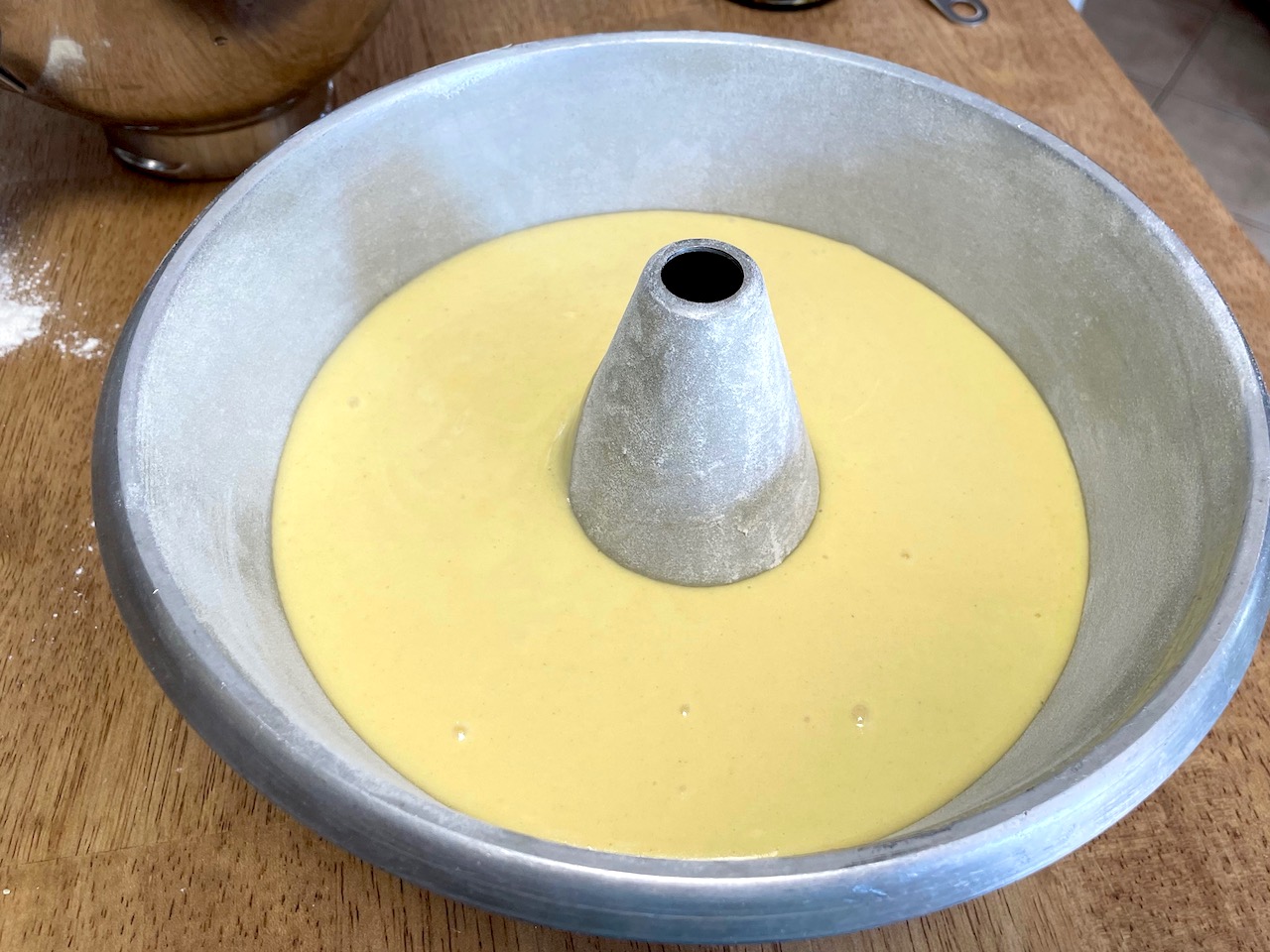 7. Pour batter into a prepared tube pan. Bang the pan on the counter 3 times.