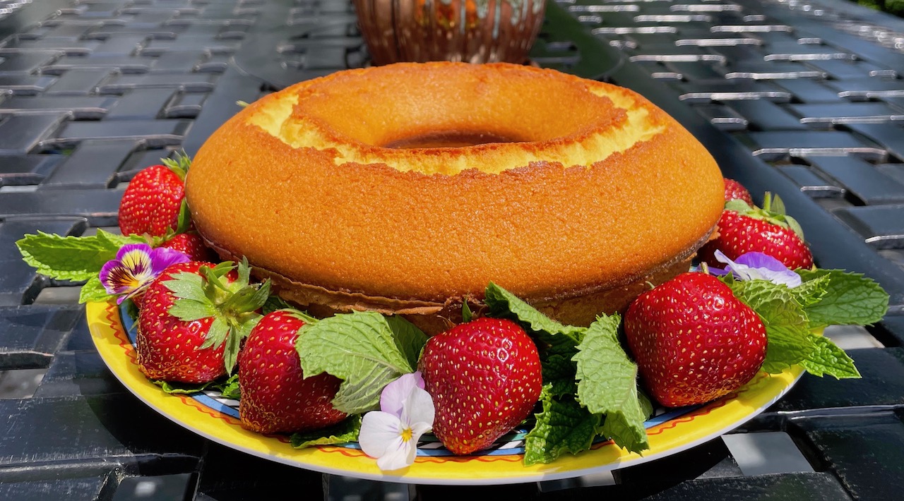 The cake can be served on its own, warm or cold, garnished with powdered sugar, or smothered in macerated strawberries and whipped cream. I highly recommend the strawberries and whipped cream version. A sprinkling of fresh mint is also a nice touch.