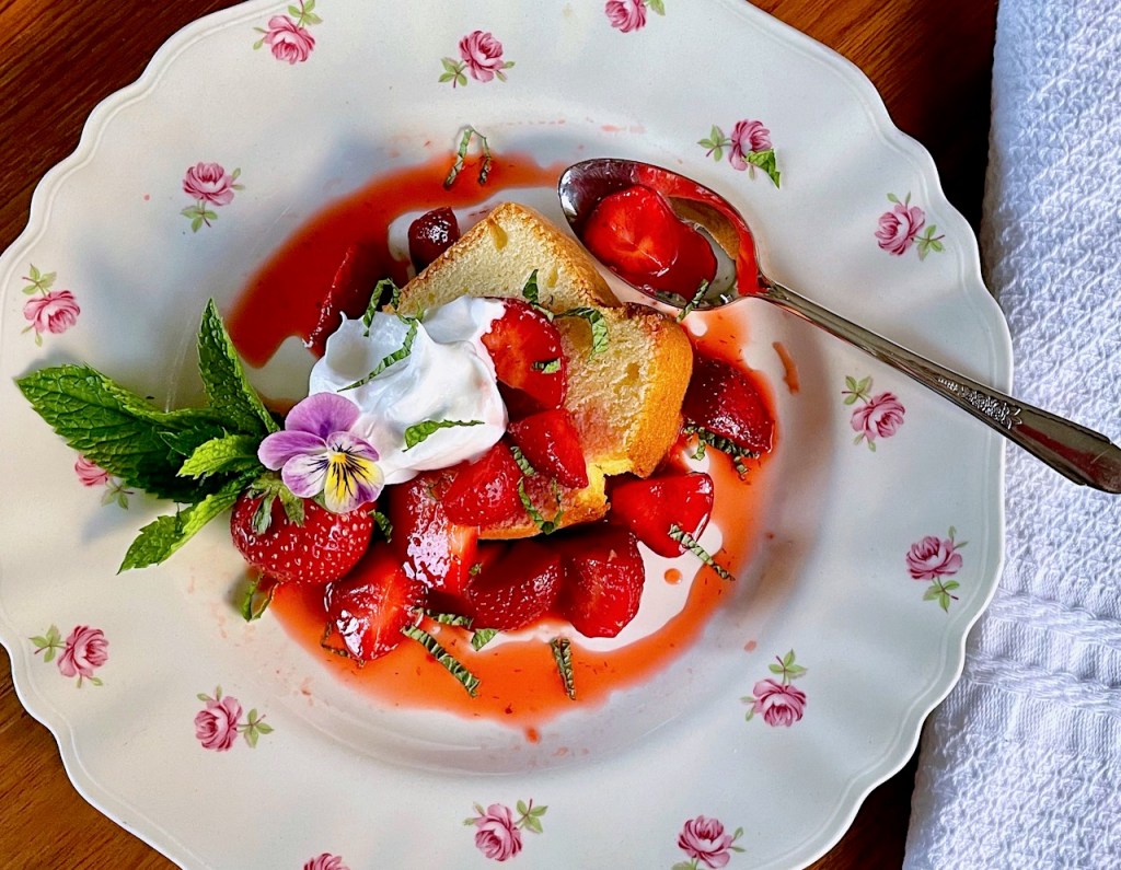 Hot milk cake strawberry mint viola