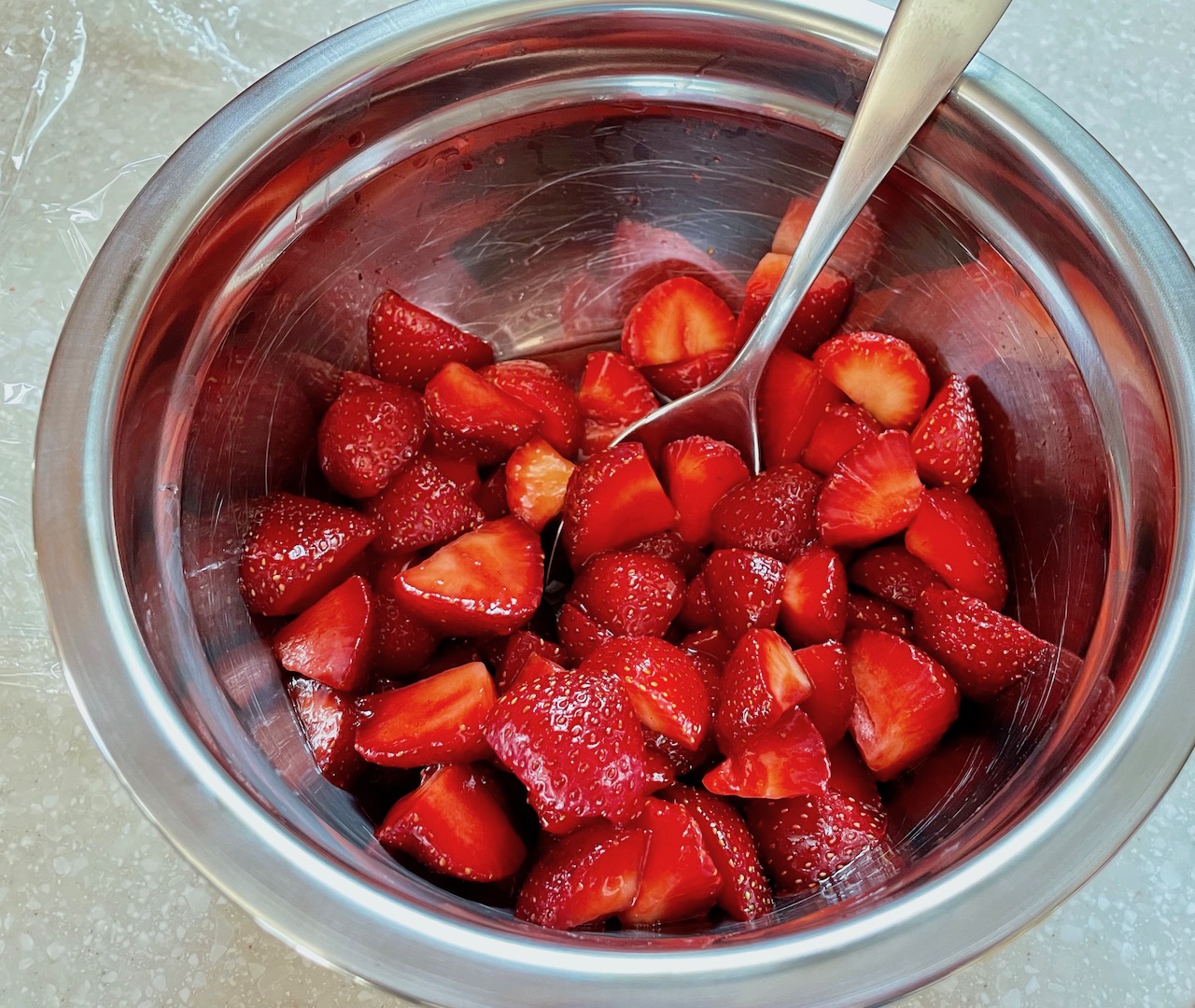 It is the perfect cake with fresh macerated strawberries. Maceration is just a fancy way to say slice up some strawberries, stir in some sugar, and let it sit at room temperature for at least 30 minutes. The amount of sugar to use depends on the sweetness of the strawberries. Here, I just stirred in about one tablespoon of sugar because the berries were already very sweet. You could also add some flavored liqueur or balsamic vinegar to the maceration.